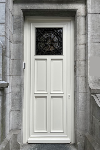 L’ensemble est peint dans un blanc RAL 9010, apportant luminosité et raffinement à l’entrée.